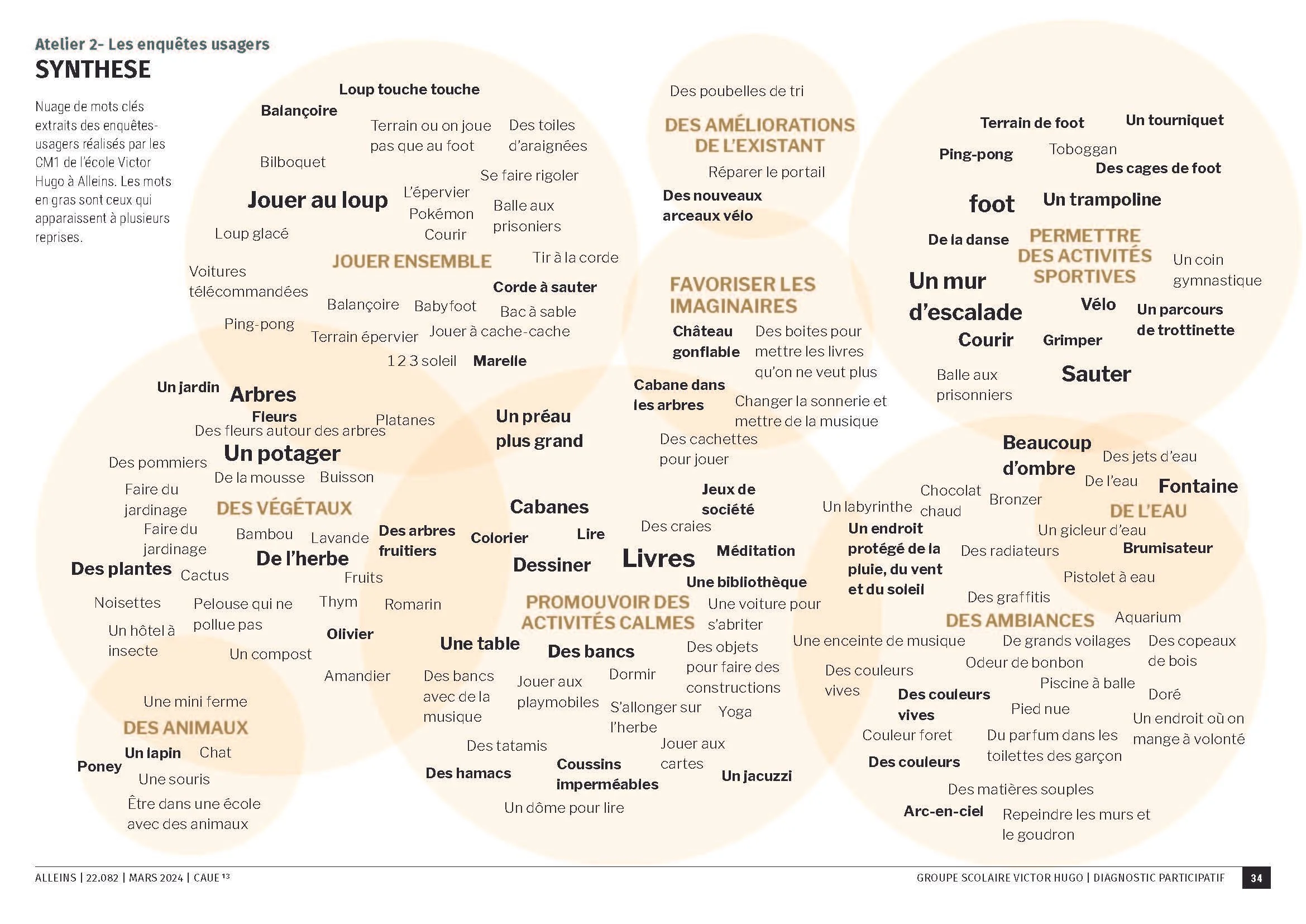 La démarche d’accompagnement de la commune d’Alleins vers l’évolution des cours de récréation du groupe scolaire Victor Hugo s’organise en deux étapes. Tout d’abord un diagnostic des maîtres d’usages (les élèves de l’école élémentaire) représentés par une classe de CM1 permet de récolter de nombreuses informations sur la cour. Trois ateliers sont menés en classe pour les amener à observer l’état existant, à interroger les besoins et envies des autres usagers et à imaginer des projets en maquette. En parallèle, un diagnostic est mené avec un groupe de travail adulte pour conduire à l’établissement d’un pré-programme commun.
