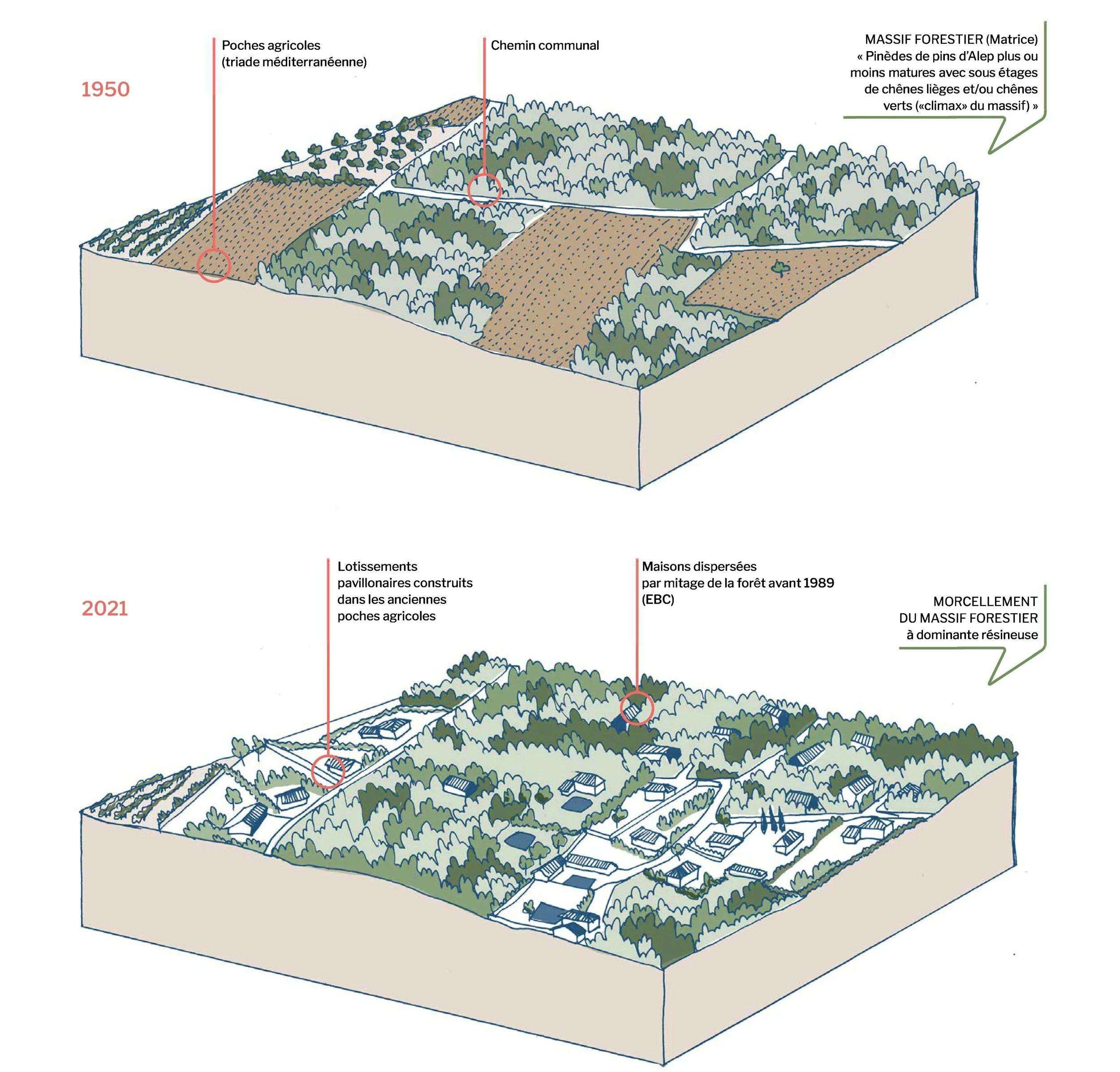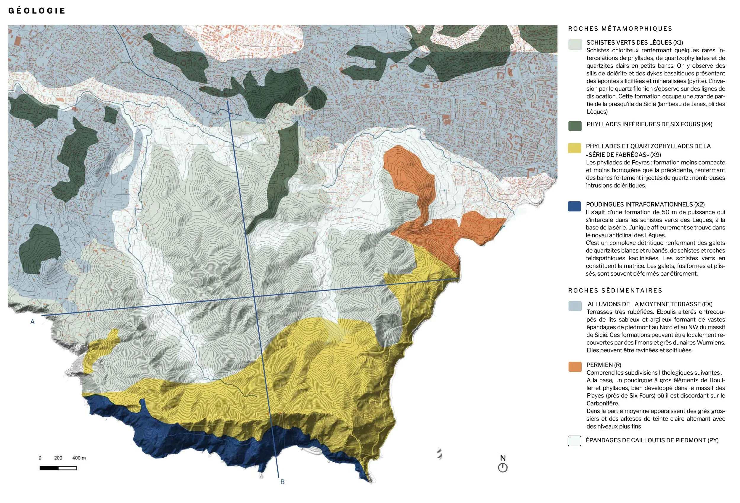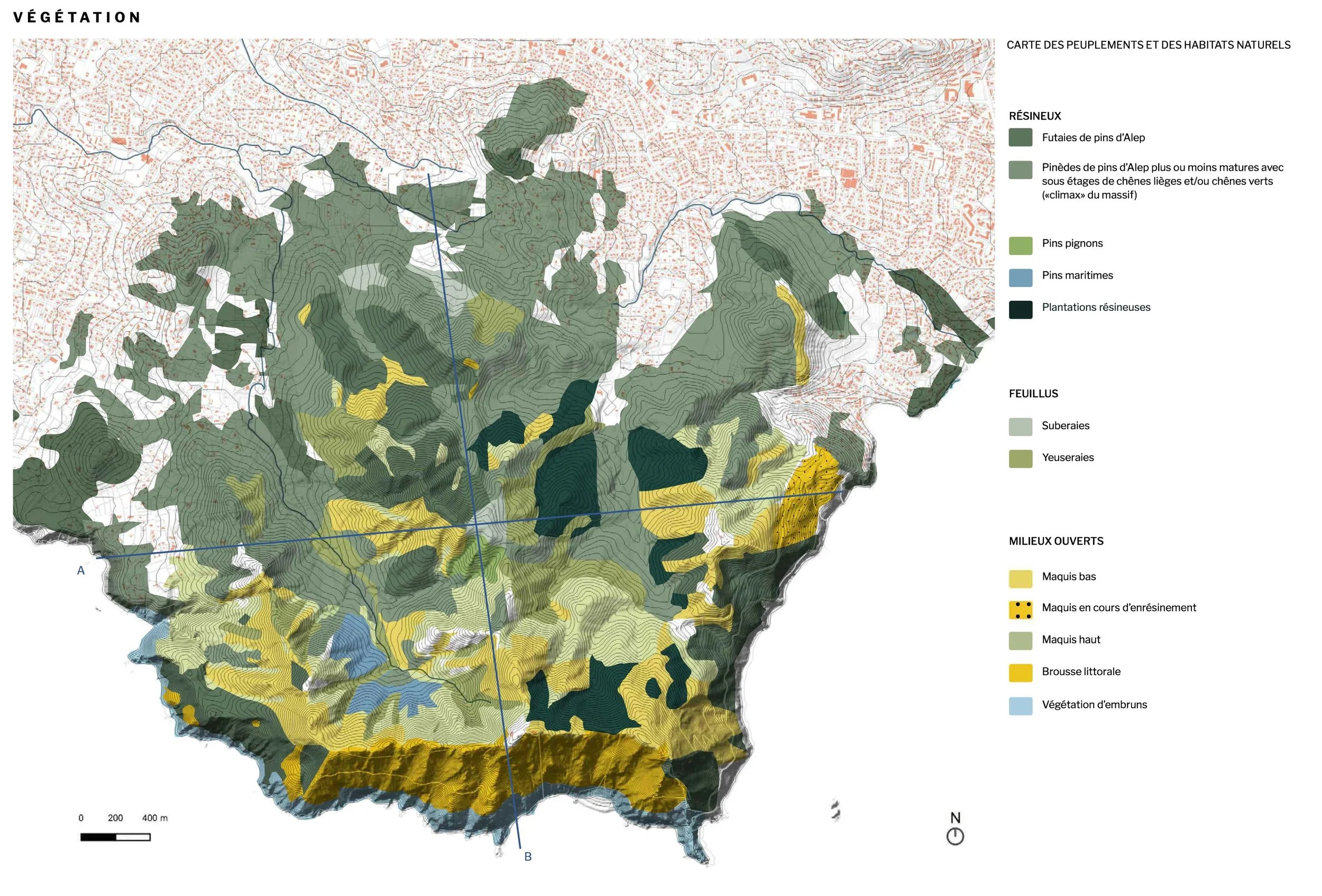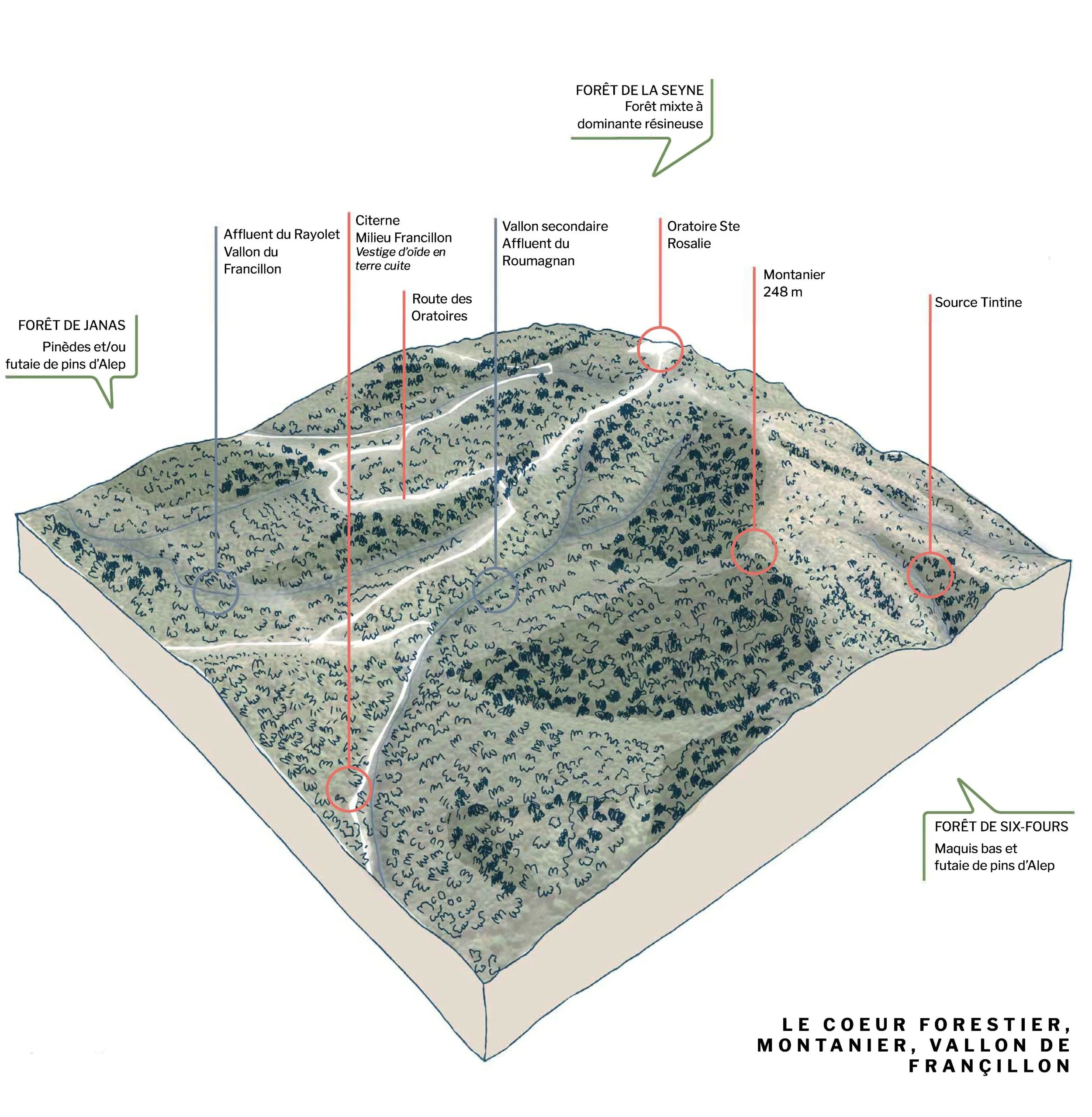 Avancée continentale la plus méridionale de la région, site classé d’environ 900 ha, précieuse forêt bordée de toute part par l’agglomération toulonnaise, le massif du Cap Sicié est un repère géographique important et un site périurbain attractif où de nombreux usages prennent place. La métropole souhaite poser les bases d’une gestion globale et d’une politique de mise en valeur cohérente à l’échelle du massif, réparti sur deux communes. Après un premier recensement du petit patrimoine bâti, l’étude paysagère offre un regard transversal sur les boisements, la géomorphologie, le réseau hydrographique, les usages passés et présents, les imaginaires, les interfaces ville-massif ou encore le jeu d’acteurs qui façonnent et occupent les lieux. Elle propose la définition d’unités paysagères et des scenarii prospectifs pour donner à voir les conséquences possibles des tendances à l’œuvre. En utilisant la force des images et du récit, la démarché interpelle l’interlocuteur pour motiver un engagement, notamment politique, en faveur de la protection et de la mise en valeur du massif du Cap Sicié.