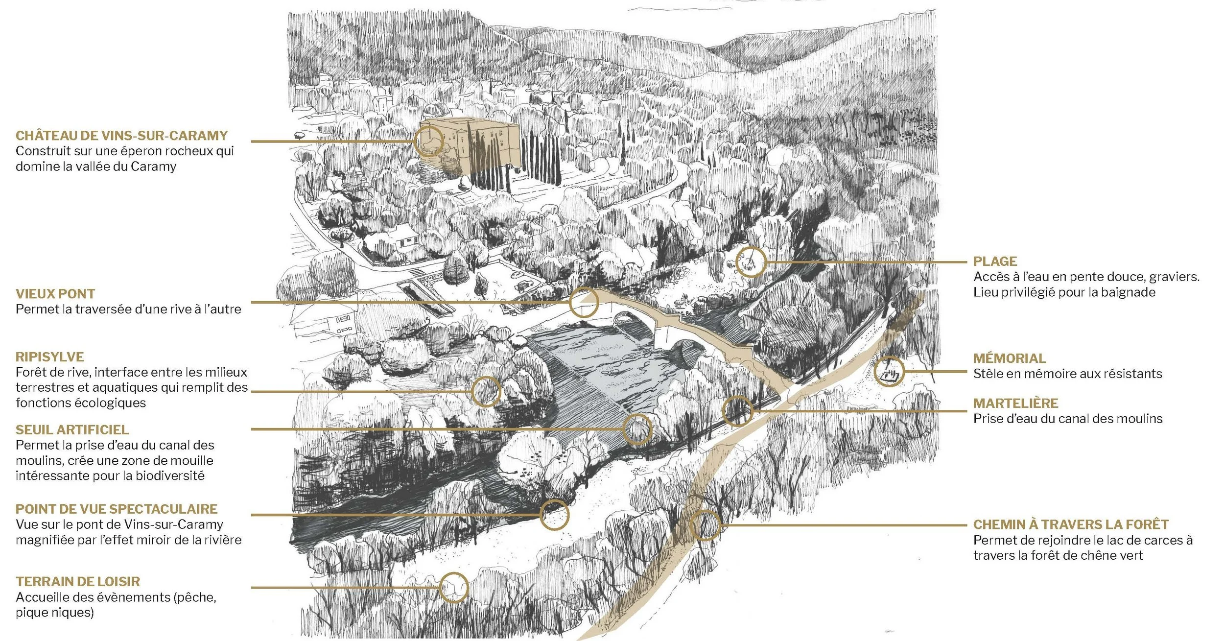Le vieux-pont de Vins enjambe le Caramy depuis le XVIe siècle et relie deux rives très différentes : une rive gauche habitée, bien exposée au soleil, et une rive droite enchantée, largement plantée, en lisière d’une vieille chênaie verte. Inscrit au titre des monuments historiques, il présente des risques structurels importants. Au diagnostic et aux prescriptions pour remédier à ses pathologies s’ajoute l’étude paysagère de ses abords. Les recommandations qu’elle présente visent à renforcer la singularité des rives, en y facilitant les usages actuels et futurs tout en fortifiant le patrimoine naturel vivant par des interventions minimalistes bien ciblées.
