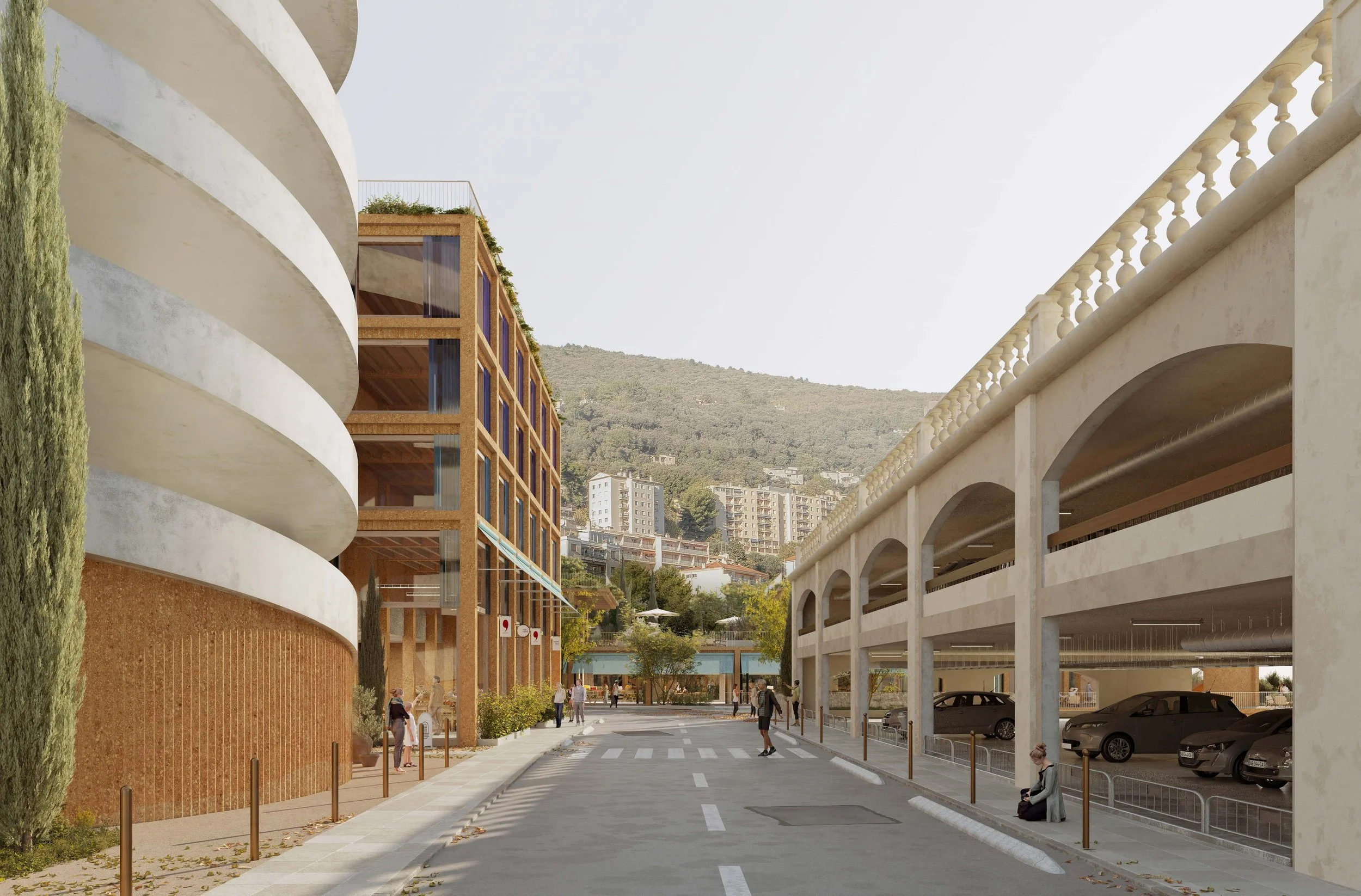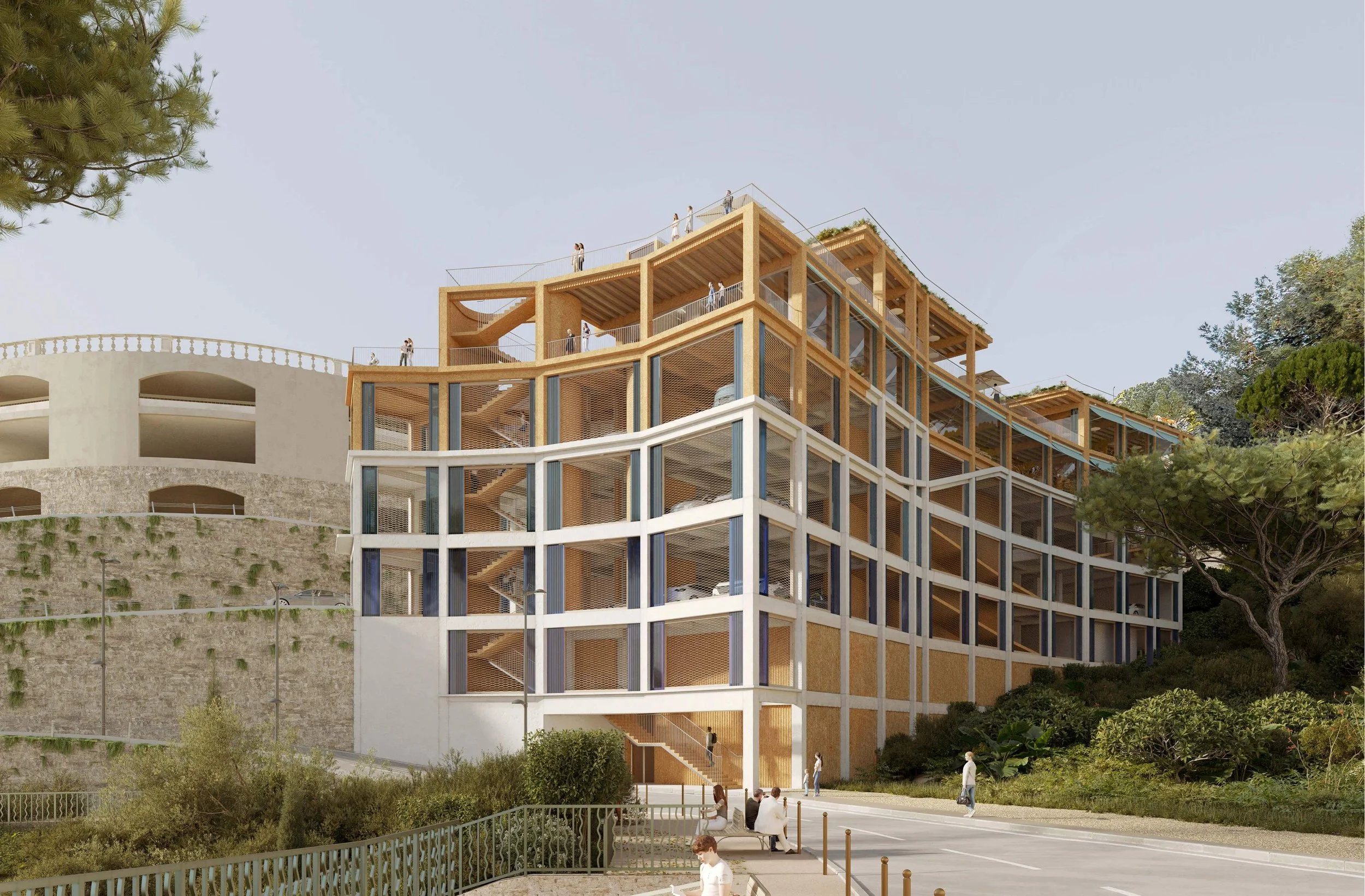 Le projet vise à intégrer le parking Notre-Dame-des-Fleurs et l’ancien garage Rolland dans le tissu urbain du centre-ville de Grasse. Les extérieurs proposent des espaces piétons requalifiés, agrandis et plantés. La végétation se décline en plusieurs strates, chacune adaptée aux espaces dans lesquels elle s’étoffe. Les toitures bio-solaires associent panneaux solaires et faible épaisseur de terre pour accueillir une strate herbacée qui joue avec les couleurs et les textures. Les toitures accessibles proposent une strate arbustive foisonnante adaptée au climat qui offre une immersion végétale pour les passants. La pleine terre du rez-de-chaussée accueille à une strate arborée dont l’ombrage et la fraîcheur profitent à la rue.